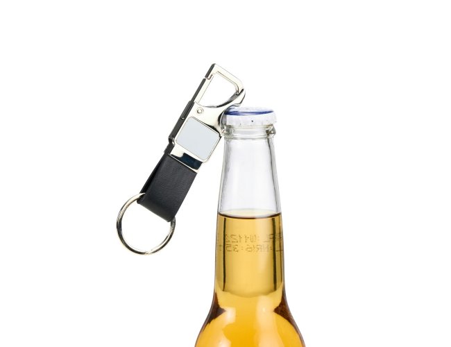 Descrição: Chaveiro em metal com tira em couro sintético.