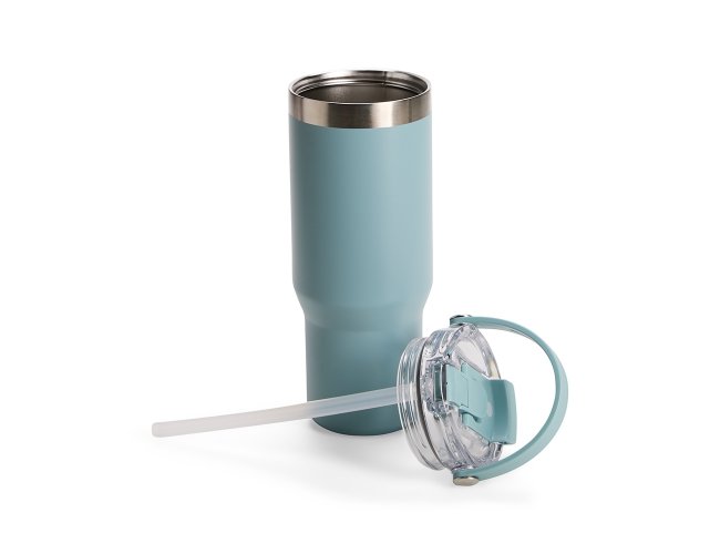 Copo térmico em aço inox com capacidade de até 900ml. Apresenta construção em parede dupla, tampa rosqueável plástica com vedação a vácuo e tampa adicional com proteção para o bocal, o que permite a conservação da temperatura de líquidos por mais tempo. Conta ainda com bico flip, canudo plástico interno removível e alça para transporte. Sua pintura eletrostática confere uma cor duradoura e um acabamento de alta qualidade.