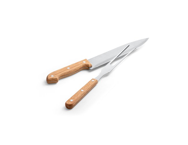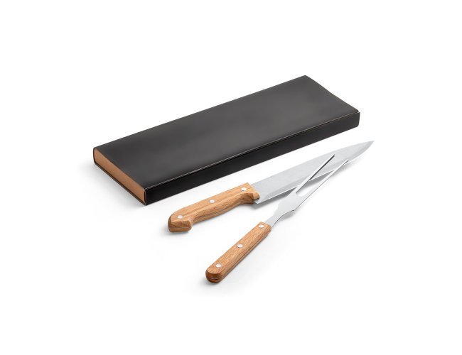 Kit churrasco em caixa kraft de papel reciclado. Composto por 2 utensílios em aço inox e bambu: faca chefe e garfo. Certificação EU Food Grade. A cor e o resultado da impressão nos materiais naturais pode variar entre produtos