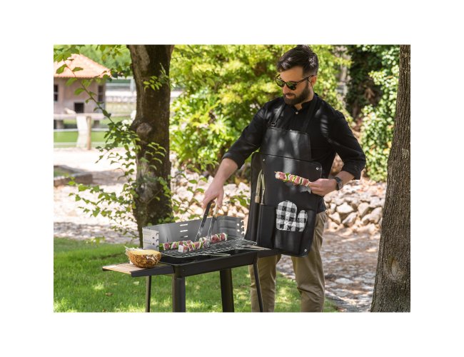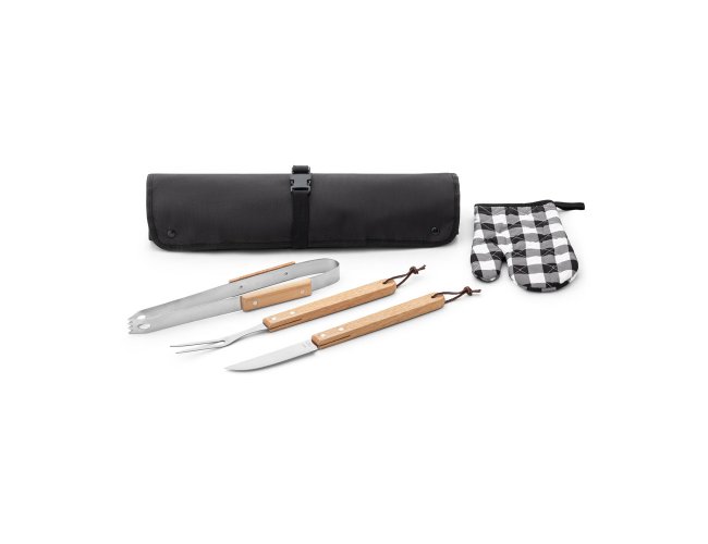 Kit churrasco composto por 3 utensílios em aço inox e madeira de Seringueira - faca, garfo e pinça - e uma luva de cozinha. O estojo dobrável em 600D pode ser convertível em avental para sua proteção. Certificação EU Food Grade. Dobrado e fechado: