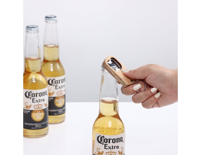 Descrição: Chaveiro em madeira com abridor de garrafas em metal e argola de ferro niquelado.