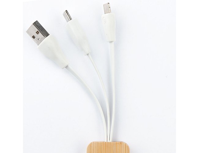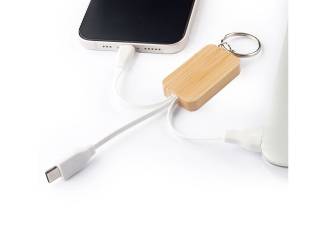 Descrição: Chaveiro de bambu com cabo para carregamento, entrada usb, lightning e tipo C.