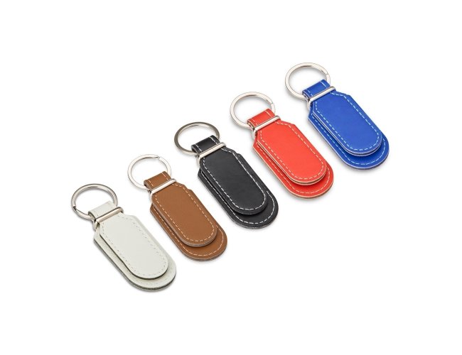Descrição: Chaveiro em formato minimalista em couro sintético com frente e verso lisos e argola de ferro niquelado.