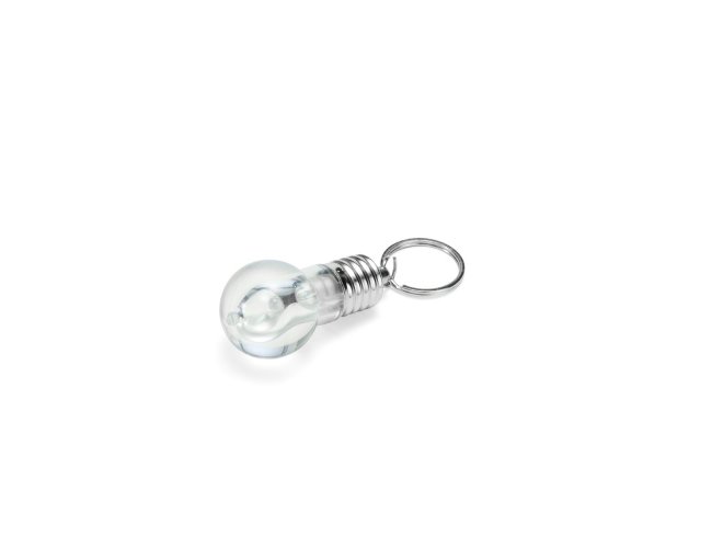 Descrição: Chaveiro em formato de lâmpada, produzido em plástico e metal, com iluminação funcional em LED acionada por botão.