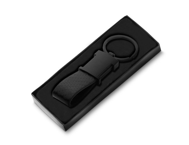 Descrição: Chaveiro de metal em níquel brilhante com alça em PU, frente lisa e verso com dois parafusos.