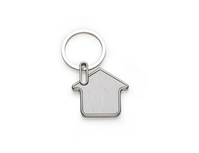 Descrição: Chaveiro metal formato casa com chapa inox frente e verso lisa.