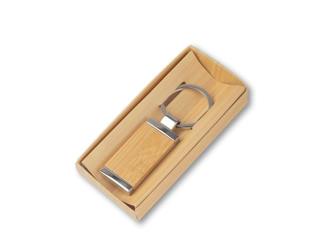 Descrição: Chaveiro de metal retangular, frente com detalhe em bambu e verso liso.