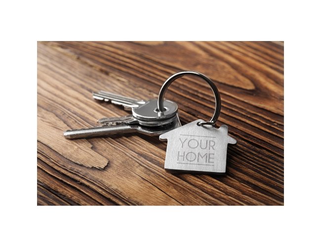 Descrição: Chaveiro plaquinha metálica em formato casa com pintura fosca, frente e verso liso.