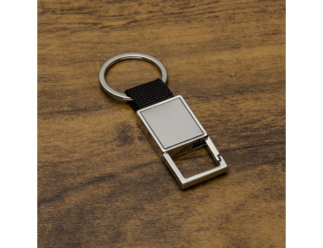 Descrição: Chaveiro de metal com mosquetão (sem trava) e alça de nylon.
