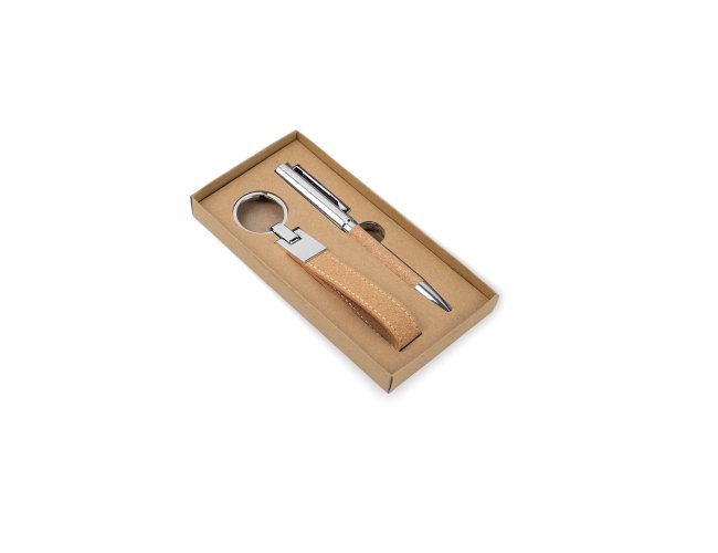 Conjunto composto por uma esferográfica e um chaveiro, ambos em metal e cortiça.