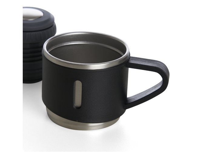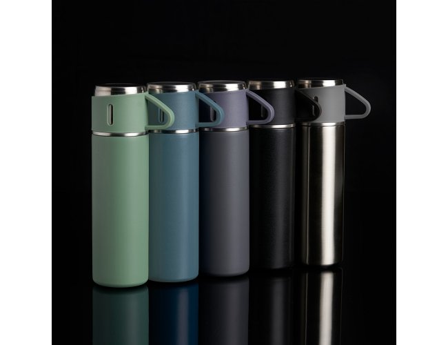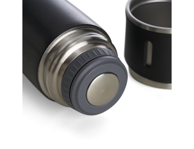 Garrafa térmica 450ml em inox com tampa que pode ser utilizada como caneca, tampa interna em plástico resistente (basta um clique para abrir ou fechar), base com borracha antiderrapante.