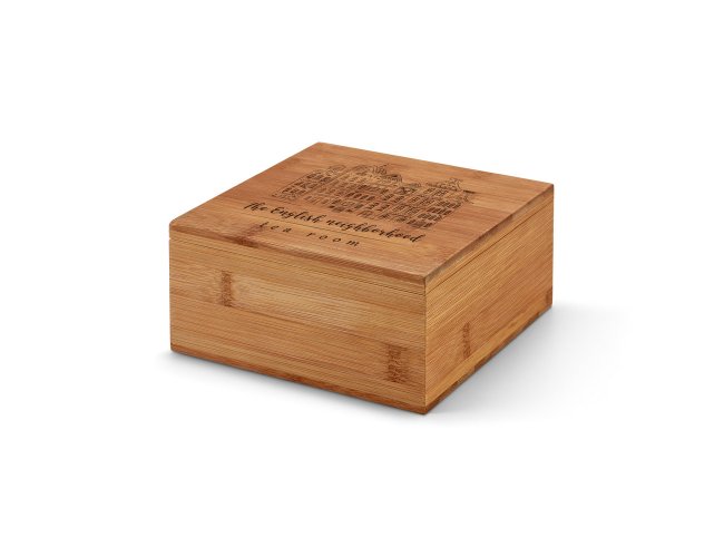 Caixa para chás em bambu, com 2 compartimentos e fecho com ímã. Fornecida em caixa presente de papel kraft reciclado. Certificação EU Food Grade. A cor e o resultado da impressão nos materiais naturais pode variar entre produtos.
