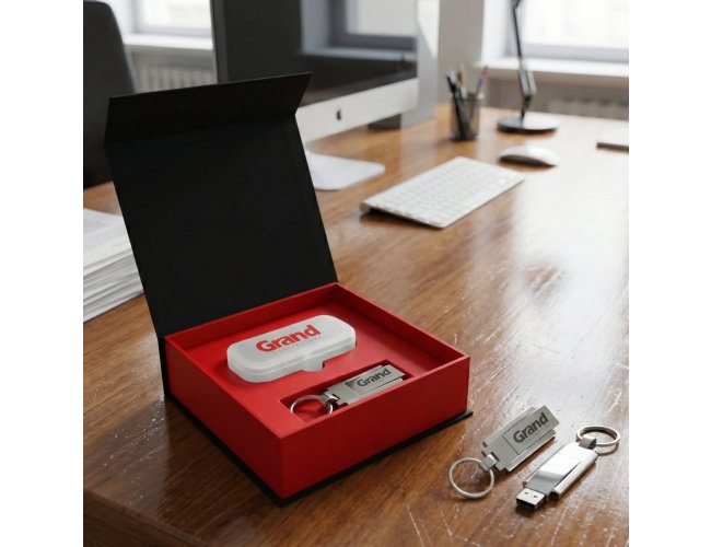 Na parte interna um berço com corte vinco no formato do estojo p/ chaves e rebaixo para adequar Pen drive chaveiro.