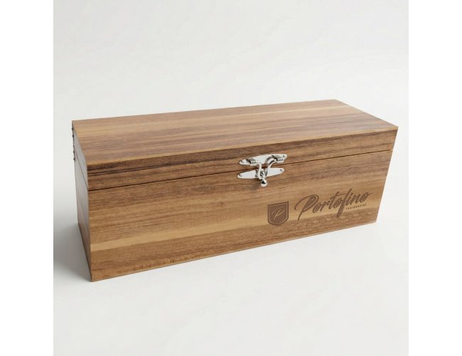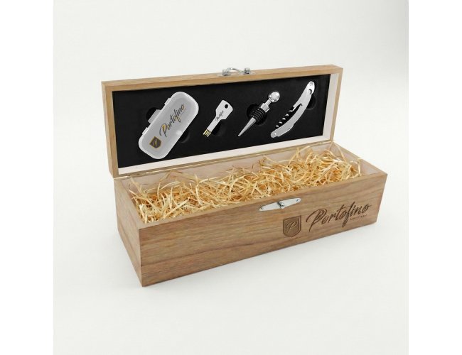 Na parte superior da tampa EVA preto com corte laser nos formatos do estojo porta chaves, pen drive, tampa e saca rolha.