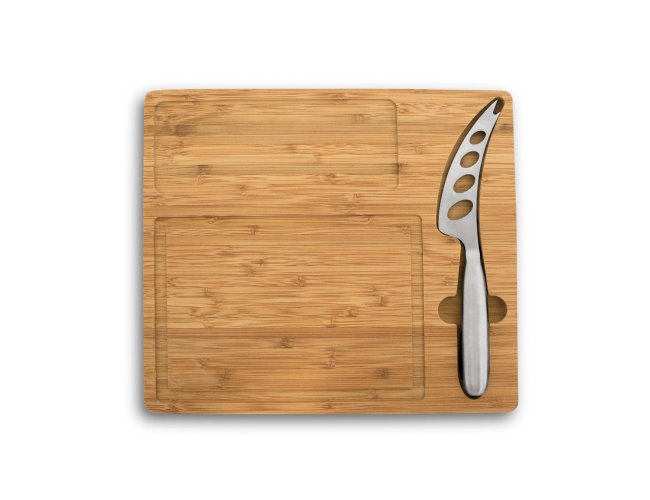 Tábua de queijos em bambu com faca inclusa. Fornecido em caixa presente de papel kraft reciclado. Certificação EU Food Grade. A cor e o resultado da impressão nos materiais naturais pode variar entre produtos.