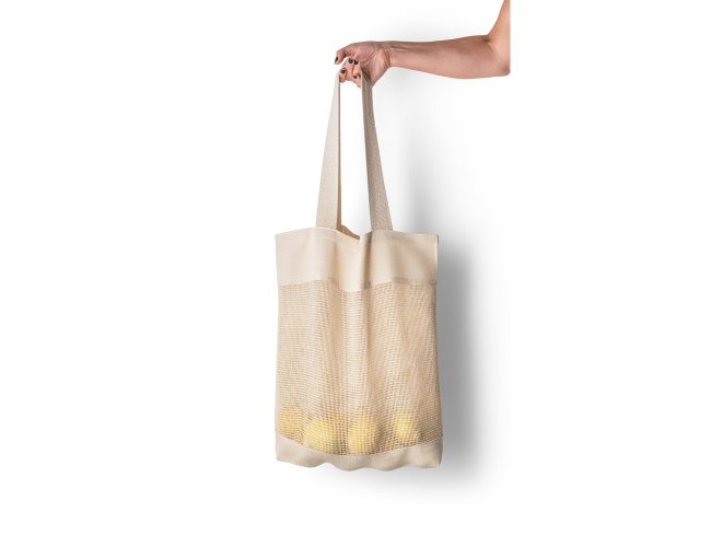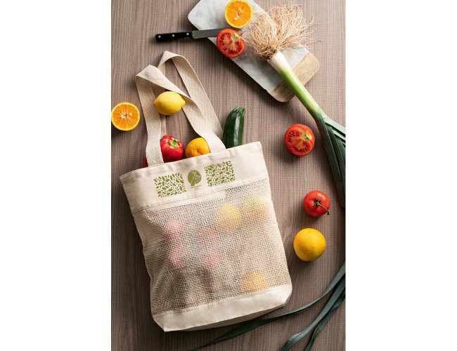 Sacola em 100% algodão (180 g/m²) com malha 100% algodão (100 g/m²) na parte frontal.