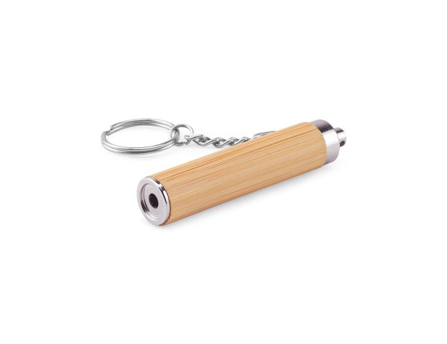 Chaveiro em bambu e ABS, com lanterna LED. Tem incluso 3 pilhas LR41. Fornecido em caixa presente de papel kraft.